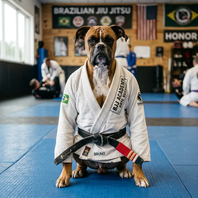 a portrait photo of a serious Boxer (dog) wearing a brazilian jiu jitsu gi with a blackbelt.