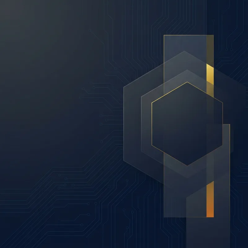 A professional, minimalist background image for a corporate presentation. The style is clean and modern with a dark, sophisticated color palette of navy blue (#0F1C3F) and charcoal gray, accented with subtle gold (#FFD700) or amber details. The composition features a large, elegant, semi-transparent geometric shape on the right side—either a circle, hexagon, or overlapping rectangles. To the left, there is ample clean, empty space for text overlay. In the background, a very subtle, abstract wave pattern or circuit board texture in a slightly lighter shade of blue adds depth without being distracting. The overall atmosphere is futuristic, professional, and sleek, suitable for a technology or education presentation. The image should be high resolution, 16:9 aspect ratio, and have a calm, focused mood.