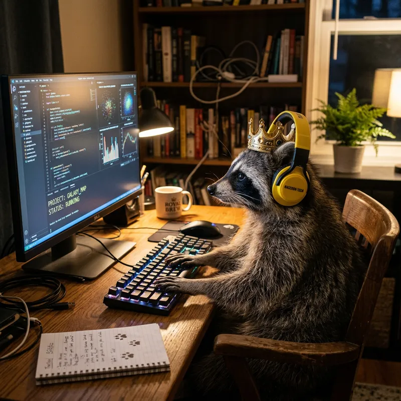 a raccoon and a computer screen leaned back intently working with bright yellow headphones and crown on his head.