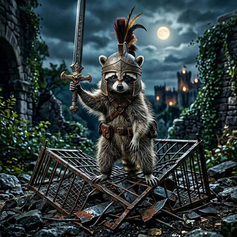 A raccoon standing triumphantly on the remnants of a broken metal cage, wearing a helmet that resembles the ones worn by ancient conquerors. In its right paw, it firmly grasps an elegant yet intimidating sword, ready to face any challenge that comes its way.