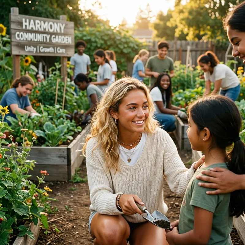 a realistic 19 year old girl with blonde hair grey eyes and tan skin. who is very empathetic and loving leader.