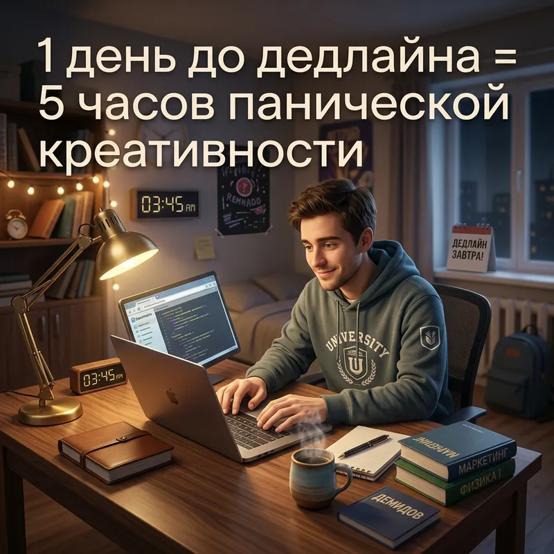 A realistic and friendly version of the previous scene. A cozy, warm student room at night. A friendly-looking student is sitting at a wooden desk, focused and smiling slightly while working on a laptop. The lighting is soft and warm from a desk lamp, creating a cozy atmosphere. The room is tidy but lived-in, with some books and a steaming mug of tea. The style is photorealistic with cinematic soft lighting. Include the Russian text clearly: '1 день до дедлайна = 5 часов панической креативности' in a clean, modern, soft font. No UI elements, no carousel dots, no arrows. High quality, realistic textures.