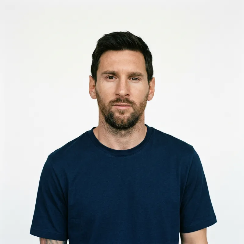 A realistic image of Lionel Messi with a neutral expression, looking calm and indifferent, on a plain white background.