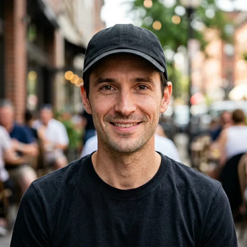 A realistic portrait of a man in his mid-30s with fair European skin, a clean-shaven face, and a black baseball cap. The image should be highly detailed and have a sharp focus with blurred background. He will have brown eyes, a thin face, a slight smile, wearing a black t-shirt.