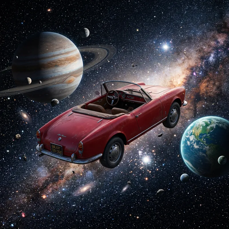a red car floating in space, surrounded by stars and planets