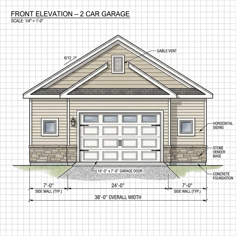 a rendering of a front elevation of a 2 car garage structure with 7ft of side wall on each side totaling 38ft in width with the garage door depicted