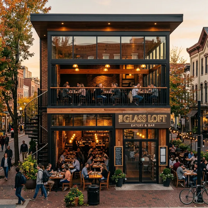 a restaurant with a glass windows and a loft.