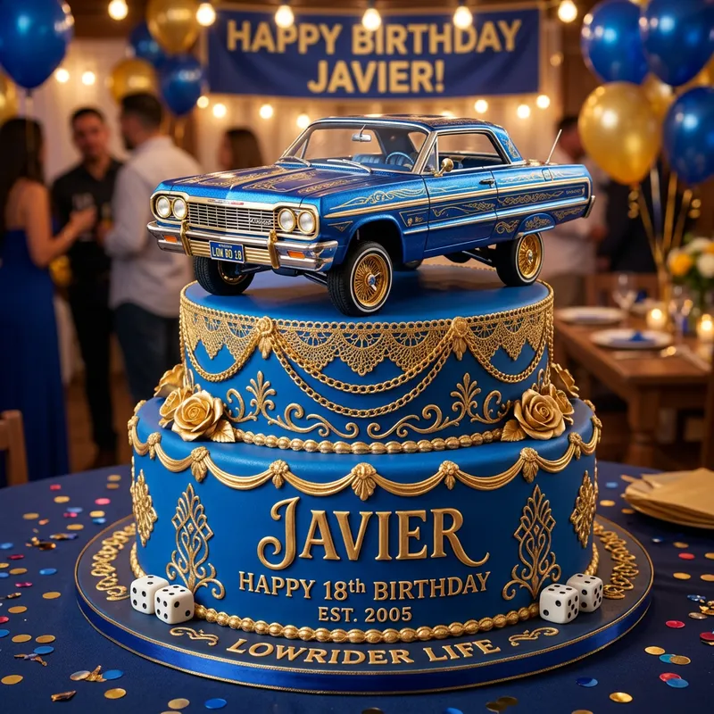 A Royal Blue and Gold Low Rider Car Birthday Cake.