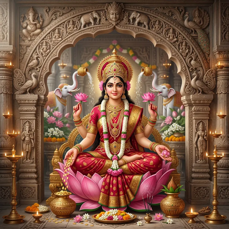 A serene and majestic depiction of goddess Lakshmi, seated in a lotus position. She is dressed in elegant, traditional Indian attire, with ornate jewelry and a sophisticated crown. The rich, vibrant colors of her clothes contrast beautifully with her radiant skin. Her eyes, full of wisdom and kindness, are slightly closed in a meditative state, as she holds in her various hands symbols of prosperity and wellbeing. Her backdrop is a grand, intricately designed archway, adorned with detailed carvings symbolizing Indian mythology. Render this scene with a balanced blend of realism and artistic symbolism, all set in a peaceful, ethereal ambiance. With open eye..