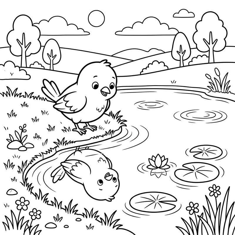 A small cartoon bird standing near a pond, looking at its reflection in the water. The background includes a couple of lily pads, a small patch of grass, and a few simple ripples in the water. The scene is calm and fun for coloring without too many details.