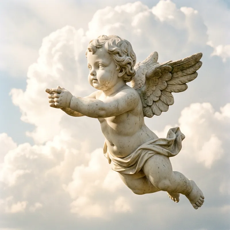 A small Caucasian baby angel, with cherubic features and feathered wings, is depicted in flight. The angel exhibits the pose and stillness of a statue, an impression furthered by its stone-like texture. Its chubby hands are extended forward, and it appears to be aiming at an unseen point. The scene is set against fluffy clouds lit by the radiant sunshine.