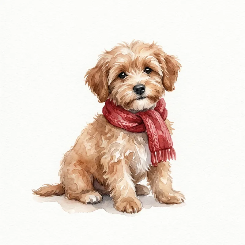 A small fluffy dog sitting in a relaxed pose, painted in delicate watercolor. It wears a red scarf and has warm brown fur. Gentle color bleeding and soft shadows create a cozy handmade look. Background is pure white.