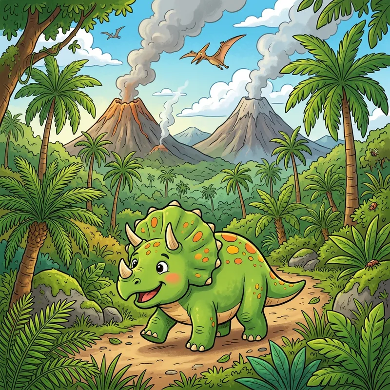 A smiling, cartoon-style dinosaur in a prehistoric jungle, with volcanoes and palm trees in the background.