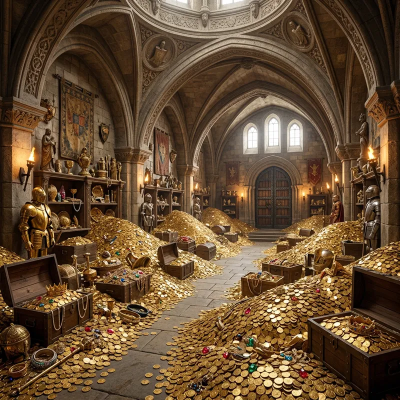 A spacious treasure room filled with gold and treasures.