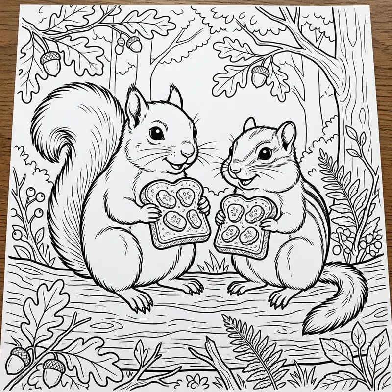 A squirrel and a chipmunk sitting together, each holding a slice of toast with pickles. The animals are realistic yet cartoonish, with friendly expressions. The scene is outlined in black and white, suitable for a coloring page.