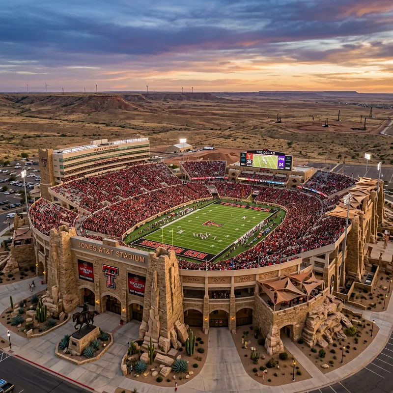 A stadium for the Texas Tech Red Raiders football team that has elaborate features and is desert themed.