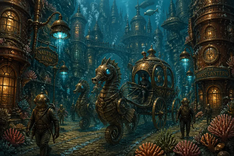 A steampunk underwater city with brass and copper buildings covered in barnacles, mechanical seahorses pulling ornate carriages through coral-lined streets, air bubbles rising from steam vents, Victorian divers in spherical helmets walking on seabed, bioluminescent streetlamps, highly detailed digital illustration, cinematic lighting.