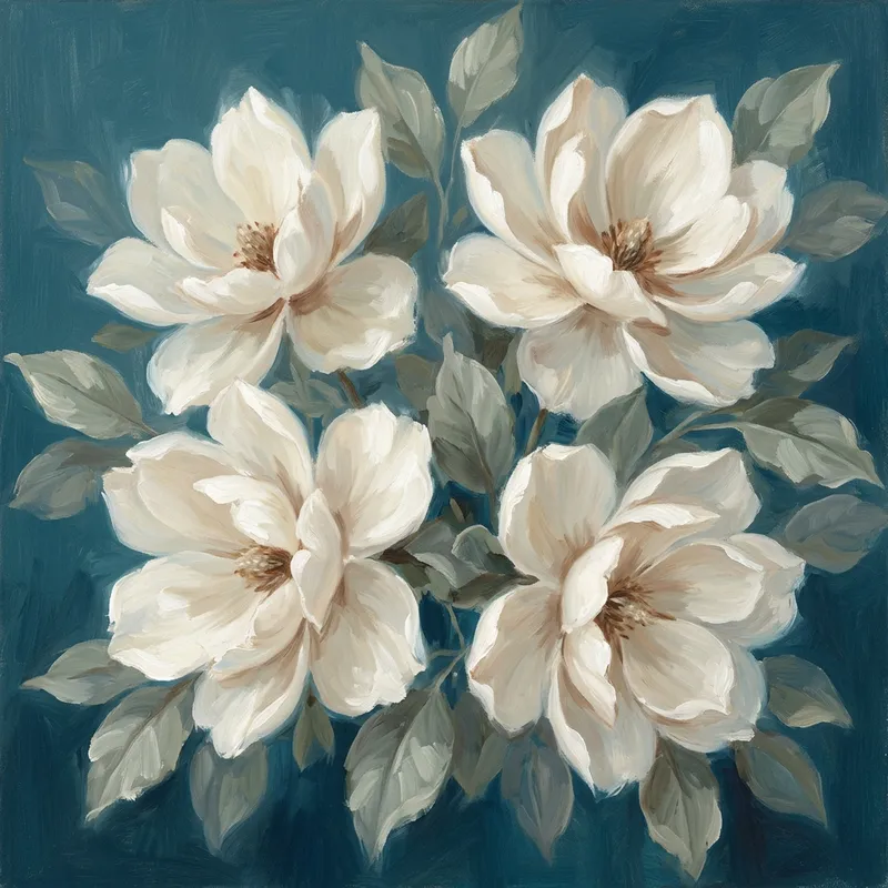 A still life painting featuring a cluster of four large, delicate white flowers. The flowers are a soft cream color with subtle shading and hints of light brown at the centers and along the petals, creating a sense of depth and texture. The blossoms are surrounded by muted, grayish-green leaves, also with a soft, painterly texture. The leaves and flowers are arranged loosely, in a bouquet-like composition. The background is a deep teal blue, providing a stark contrast to the white blooms. The lighting is soft and diffused, creating a gentle ambiance. The style is impressionistic, with visible brushstrokes adding to the painterly effect. The overall mood is serene and peaceful. The flowers are positioned throughout the image, not concentrated in a single area, showcasing a balanced composition and a natural arrangement of flowers and leaves. The perspective is slightly above the flowers, creating a sense of a garden or floral arrangement.