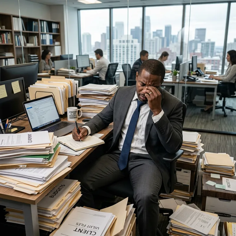 A stressed Black man in his late 30s wearing a formal business suit and tie, sitting at a cluttered desk in a modern corporate office. The desk and floor are overflowing with stacks of paperwork, files, and folders. He has a tired expression, rubbing his temples with one hand while holding a pen in the other. Soft natural light from a window, muted color palette, photorealistic style, high detail.