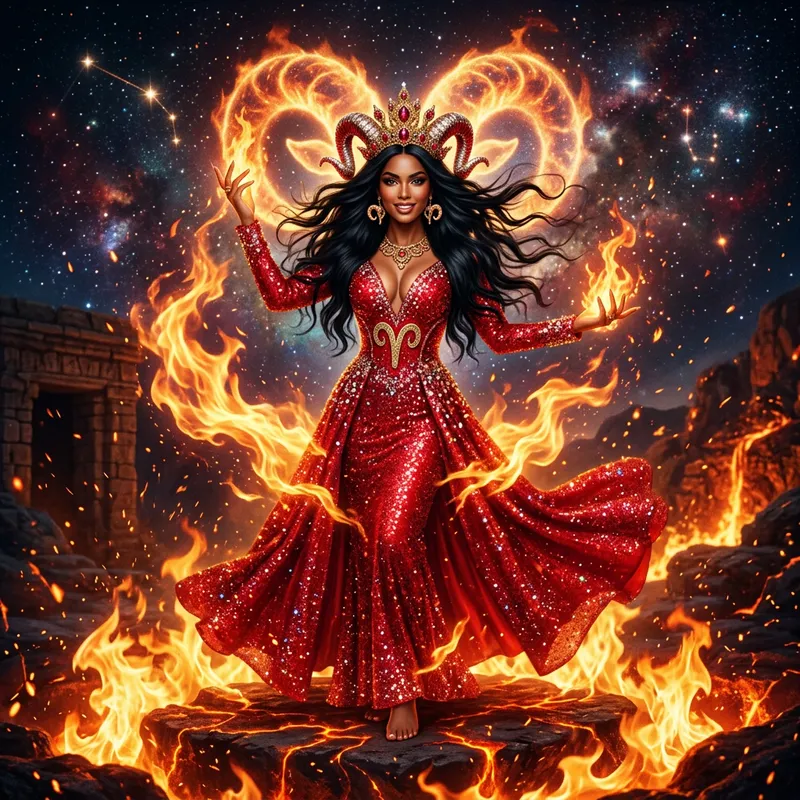 A stunning woman wearing a red sparkly gown, long dark black hair, surrounded by flames, magical, zodiac, aries.