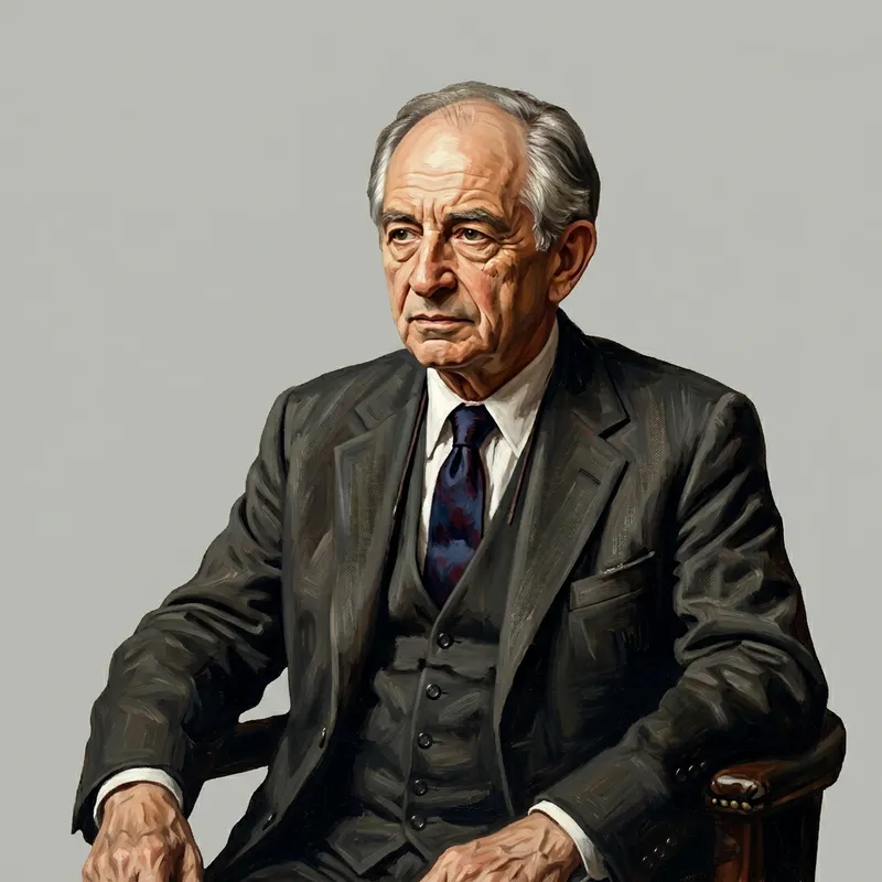A stylized portrait of Hyman Minsky, mid-20th century American economist. Depict an older man with thinning grey hair, wearing a suit and tie, seated in a study without background.