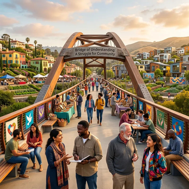 A symbolic bridge connects two diverse communities and represents communication and unity. On the bridge, people of different descents such as Caucasian, Black, Hispanic, and South Asian engage in dialogue, share ideas, and collaborate. The scene is vibrant and hopeful, with beautiful landscapes on both sides. Warm colors are used to evoke a sense of togetherness and community. The phrase 'Bridge of Understanding: A Struggle for Community' is incorporated artistically into the image.