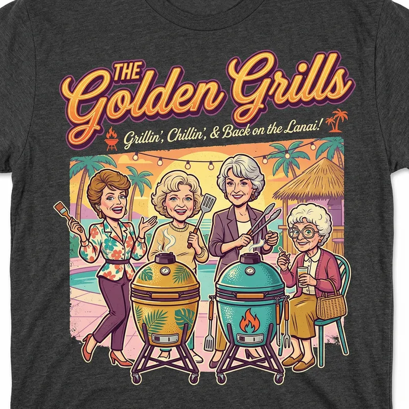 A t shirt design in the style of the show "the Golden Girls" with kamado style grills. The name on the t shirt should say "The Golden Grills" and there should be 4 women on the shirt