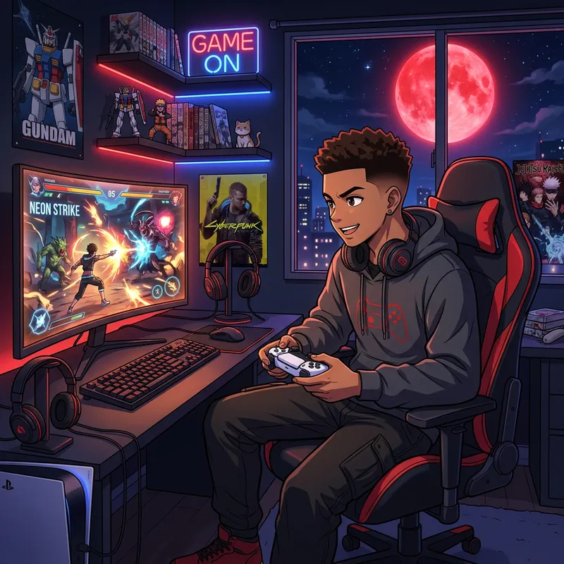 A tall, light-skinned brown boy with short, dark brown hair styled with a fade, depicted in an anime art style. He's dressed in casual clothes, prominently featuring a hoodie, and he's seen engaging in his favorite activity: playing video games. The scene has dark, red, bright red moon, bold colors, clean lines, and complex shading, much like traditional anime.