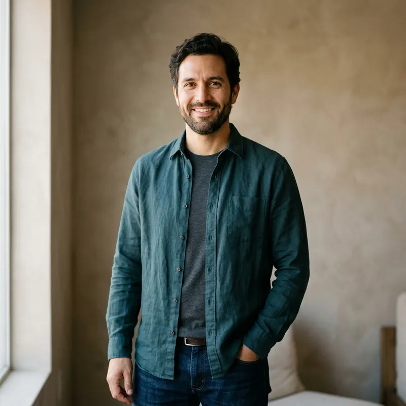 A tall, medium-bearded, 35 year-old Hispanic man, wearing casual attire. He has a friendly expression with warm brown eyes looking straight at the viewer. casting a subtle shadow on the right, highlighting the texture of his much-tended stubble . The man stands against a neutral background, adding a serene feeling to the overall portrait.