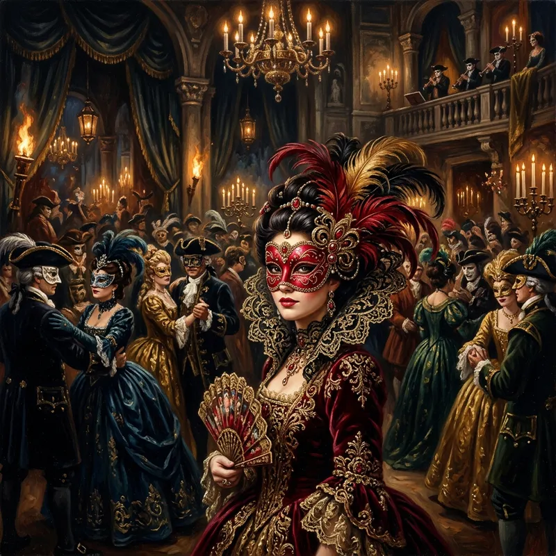 Imagine a rich, Venetian masquerade scene. The atmosphere is filled with excitement, mystery, and intrigue. Elaborate costumes in a variety of vibrant colors, embellished with glimmering decorations, are present. Many attendees adorn themselves with different styles of masks. The focus, however, is on a single distinctive mask that captures attention. It is a beautiful, intricately designed Venetian mask in radiant red. The mask features golden accents and elaborate Venetian lace around the edges, adding even more elegance to its look. Paint this mesmerizing scene using deep, atmospheric colors.