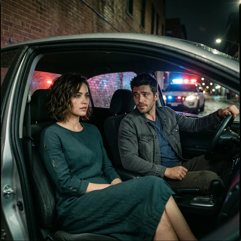 I don’t like how you’ve done it so far; I want you to do it like I’m going to tell you now. Make it like a movie where the characters are real types and super attractive. I want you to create a scene where she is in a dress, showing a little of how it looks after going through many adversities, and the guy looks almost the same but in casual clothes. She has a stylish yet not overly wild hairstyle, and they seem to encounter a wall or inside a car, with police lights visible from outside. I want you to add a touch of something like that considering the three images I sent.