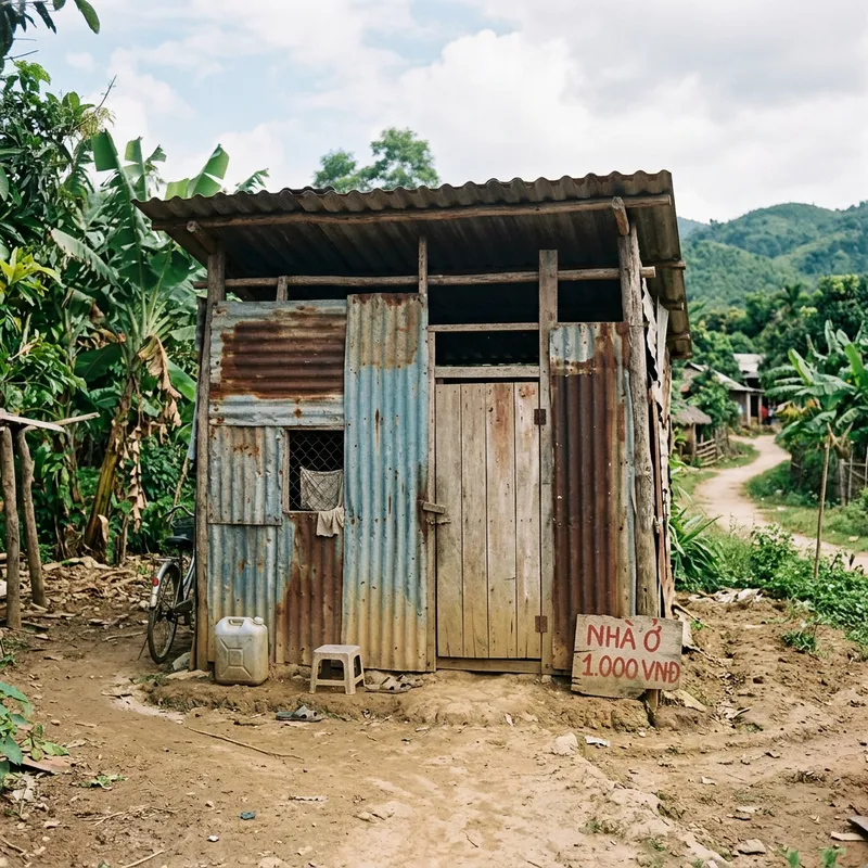 A very simple house design, representing a house worth 1 thousand VND, minimalistic and basic structure, small, simple materials