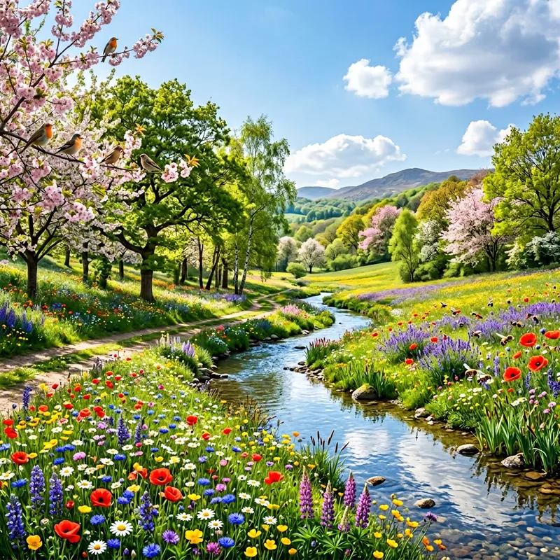 A vibrant and colorful spring scene, displaying the beauty of nature. Fields abound with a variety of bright, blossoming flowers. Sunlight filters through the trees, illuminating the flora and accentuating their colors. Birds can be heard singing on the tree branches while insects, particularly bees, are going about their daily tasks in the flowers. A gentle breeze rustles the leaves and stirs the petals of the flowers, adding movement to the picture. A sparkling stream winds its way through the rich, green landscape, reflecting the clear, blue sky above. ratio 2.39:1