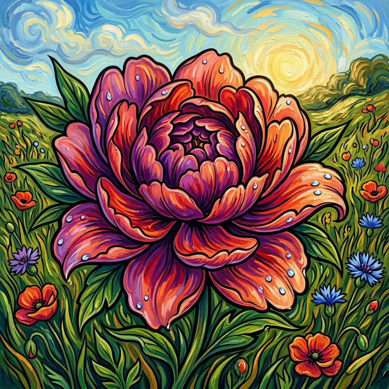A vibrant digital drawing of a meticulously detailed flower. The flower has lush, velvety petals that cascade outward from the center in varying shades of deep purples, fiery reds, and radiant oranges. Tiny dew drops appear on the edges of the petals, reflecting the gentle morning sunlight. The flower is passionately rooted in a lush meadow, with a rich array of greens in the leaves and grass. Tattoo inspired design with vibrant saturated swirling colors and bold black outlines., Impressionism, by Van Gogh.