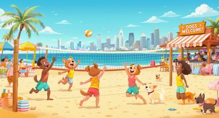 A vibrant, humorous cartoon illustration of diverse cute humanoid people and their adorable dogs playing beach volleyball together on a sunny San Diego beach. The humans are wearing bright colorful beachwear (coral, teal, yellow) and the dogs are actively participating - one dog jumping to hit the volleyball, another digging in the sand, a small dog riding on someone's shoulders. In the background, there's a beach brewery with outdoor seating where more people and dogs are having brunch. Palm trees, clear blue sky, and the San Diego skyline visible in the distance. The style is playful and welcoming, with everyone smiling and having fun. Include a beach volleyball net, colorful beach umbrellas, and a sign that says 'Dogs Welcome!' The overall vibe is joyful, inclusive, and slightly silly with dogs doing human activities.