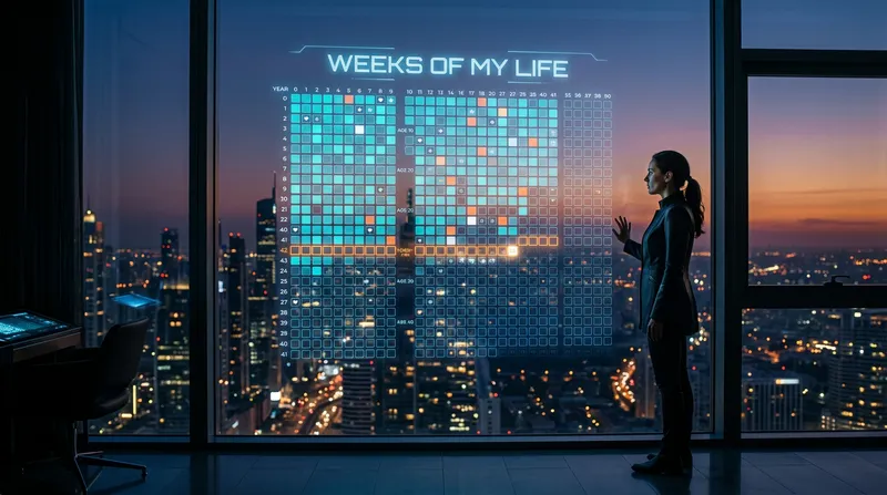 A wide cinematic shot of a person standing in front of a floor-to-ceiling glass window overlooking a city at dusk. On the window, a holographic projection of a life calendar in weeks ('WeeksOfMyLife') is displayed as a large grid. The person is looking at it, reflecting on their time. Soft blue and orange lighting, high-end sci-fi aesthetic. 4K resolution.