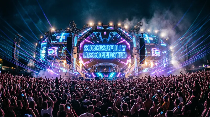 A wide, cinematic shot of a massive futuristic music festival stage. The LED screens are displaying 'SUCCESSFULLY DISCONNECTED' in huge, glowing neon letters. Lasers in blue and purple are shooting across a crowd of thousands. The atmosphere is electric and high-energy. 4K, realistic, concert photography style.
