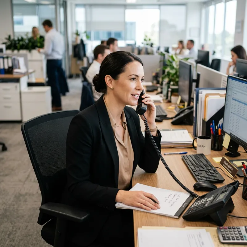A woman secretary wearing a black suit and a very light brown blouse, using a landline phone
