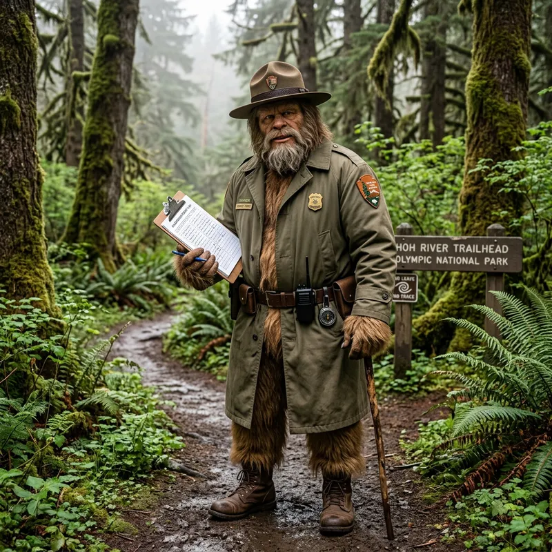 A Yeti in a trenchcoat acting as a Forest Ranger in Olympic National Park.