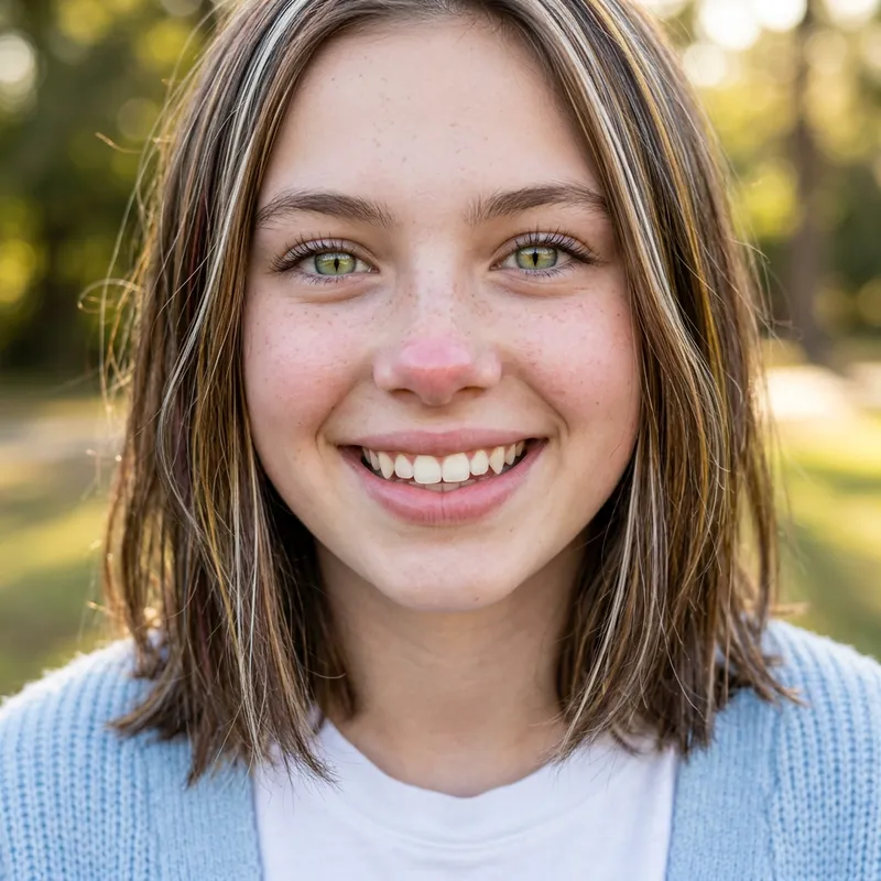 a young girl, sixteen, with beautiful innocent features. she has a cute, pink-tipped button nose with little faint freckles over it and her cheeks, long eyelashes with super pretty, light green eyes, pupils more oval like a cat. her lips are full, pink, and plump and when she smiles with an open mouth and her teeth, they're white and perfectly straight, but she has faint fangs on two of her teeth that look really cute. she has brown hair with highlighted streaks of various colors, including white, black, gold, and blonde every few strands. make the quality outstanding and give her a beautiful, innocent face with pretty cat eyes.
