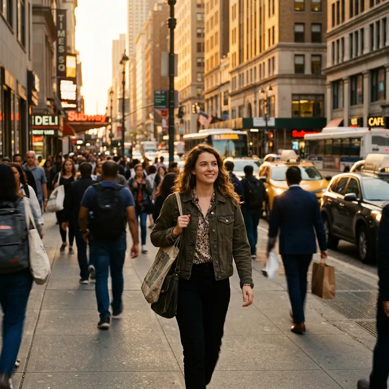 a young woman walking through a busy city street at golden hour, shot on Cinema 70mm Film, Anamorphic lens, 35mm focal length, f/2.8 aperture.