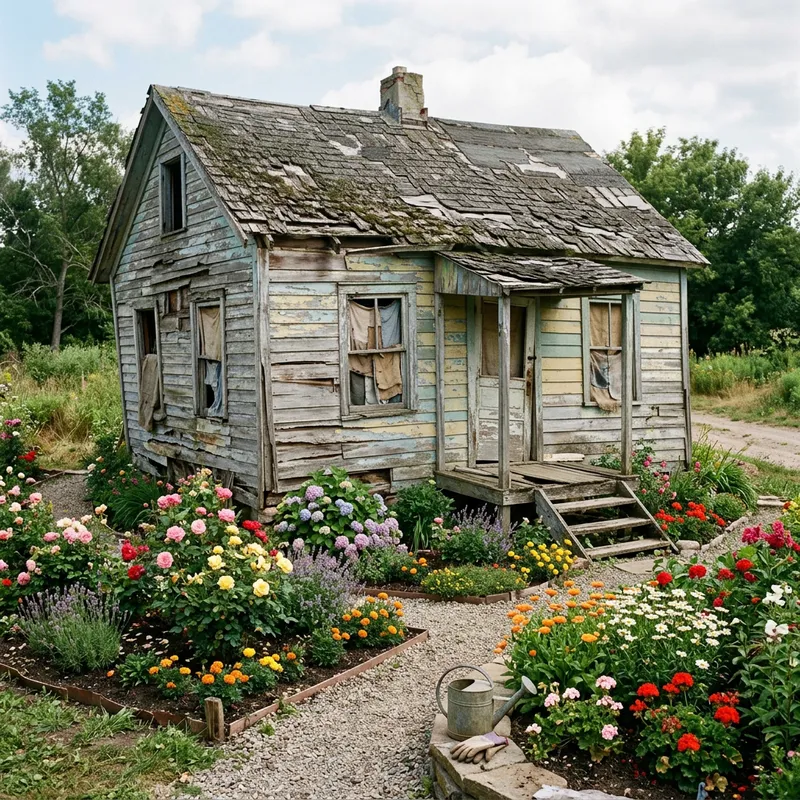 Imagine a house that appears to be worth a mere 100 dollars. It's teetering, with faded peeling paint in assorted pastel shades. It has warped wooden boards and a roof that appears to be just a few storms away from collapsing. The windows are missing glasses and in their place are temporary measures like patched clothes. The front garden, however, looks surprisingly well kept with a variety of vibrant flowers adding a much-needed splash of color to the otherwise dilapidated scene. It’s almost as if a diligent gardener is trying to provide the house with some dignity it no longer possesses on its own.