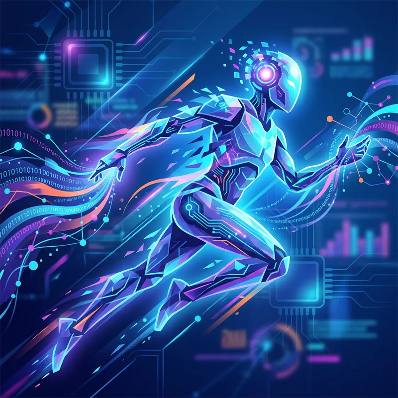 Illustration of an AI entity, rendered in a visually appealing abstract style, engaged in a dynamic pose that suggests motion or action.