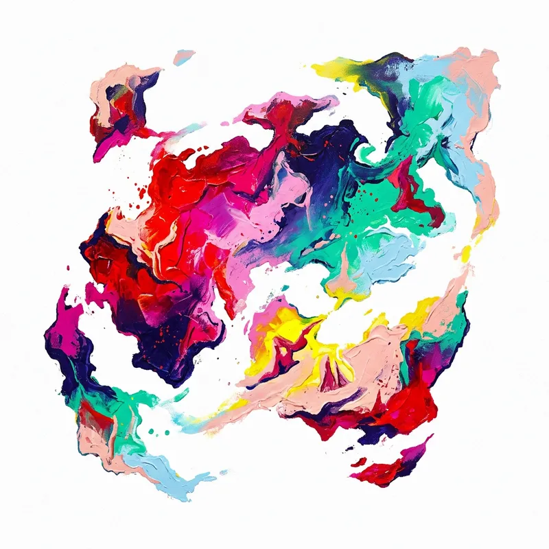 Create an abstract artistic rendering of an alien planet featuring landmasses in bold vibrant and contrasting colors such as red, pink, yellow, turquoise green, light blue, indigo, magenta, and blush. The landmasses are floating against a clean white background, truly bringing out the unique shapes of the continents. The image should have a paint-like quality, highlighting the luminescent colors and stark contrast against the white backdrop.