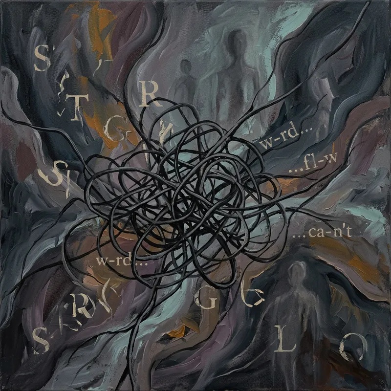 Visualize an abstract art piece depicting the concept of speech difficulties. The scene could include a muted color palette with dark tones, to represent the struggle. Intertwined lines could represent complex speech patterns, seemingly tangled, reflecting the struggle of articulating thoughts. Perhaps there could be ghostly figures, symbolic of unheard voices, surrounded by floating letters or words, symbolizing lost or unspoken dialogues. Shapes and forms can be organically flowing and filled with swirling dynamics to reflect the turbulence of the topic.