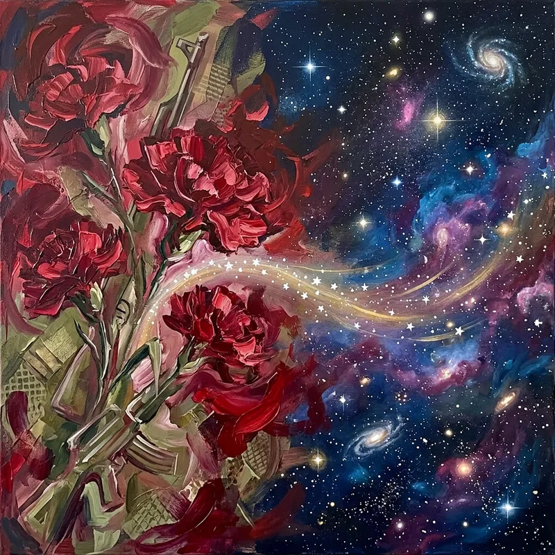 Create an abstract representation that combines the symbolism of the 1974 Carnation Revolution, showcasing key elements such as the red carnations which symbolize freedom, peace, and the armed forces' protest against the dictatorship. Integrate this with elements associated with an open universe, symbolizing unending space and infinite possibilities, with stars, galaxies, and nebulae scattered across the expansive canvas. Blend these two themes together in a harmonious, intriguing, and thought-provoking manner, encouraging the viewer to reflect on the journey from revolution to limitless potential.