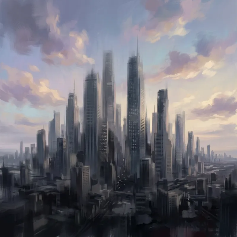Create a stylized representation of an expansive urban skyline. Picture tall skyscrapers that pierce the sky, their edges blurred by the abstract rendering. Let the buildings gradually decrease in height, creating a skyline panorama that is unique and distinguishing. Add a few soft, pastel-colored clouds scattered across the sky. Make the overall color palette muted and subdued to enhance the abstract feeling. The ground and the bottom of the buildings are shrouded in shadow, making the upper parts of the skyscrapers stand out even more against the sky.