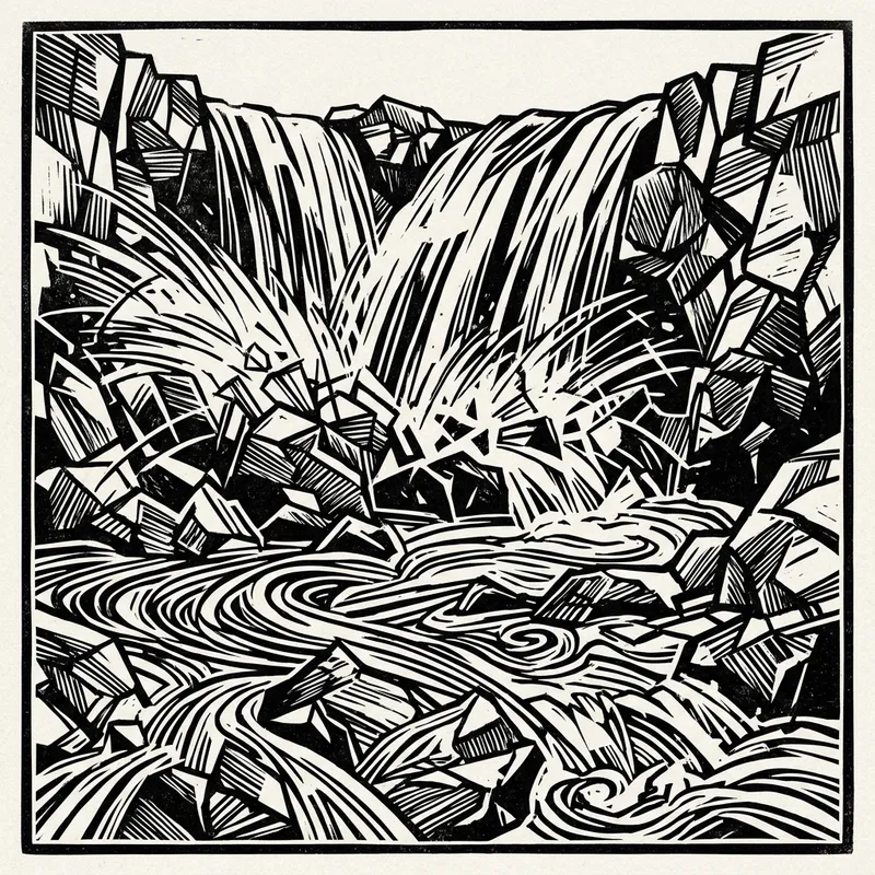 Create an abstract composition made up of a compact arrangement of lines and shapes, designed to depict the fluid dynamics of natural elements like the jagged shapes of rocks and the energetic splashes of a waterfall in a graphic style. The illustration should be in black and white tones, evoking a depth of space and the vigorous flow of a river. Imbue your rendering with an essence of movement and liveliness.