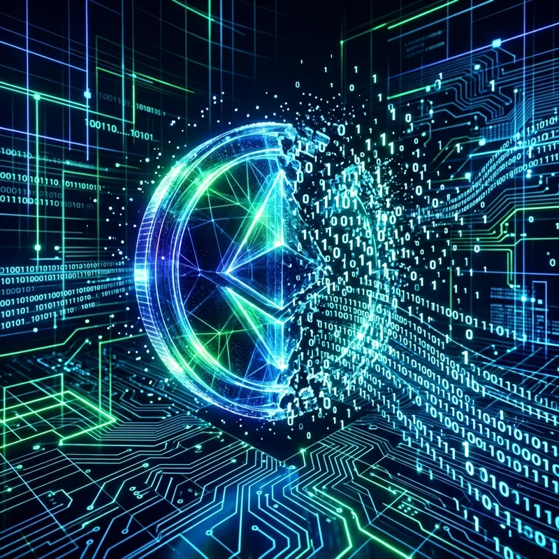 An abstract representation of digital currency. Display a fragmented, holographic coin suspended in a digital space. The coin appears to be breaking up into binary code, with ones and zeros flowing from it into the surrounding cyberspace filled with pulsing data streams and neon grids. The color scheme involves shades of deep blue and electric green, symbolizing technology and innovation while providing a futuristic and abstract feel. Add a background of circuit board patterns to emphasize the idea of high-tech finance. There should be no text or identifiable logos on the coin.