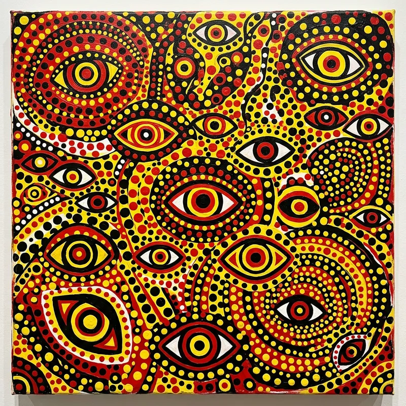 An abstract image of eyes as a central theme. It is packed with repetitive, complex patterns and bold, polka dots. The color scheme consists of vibrant hues such as red, yellow, and black. This style is reminiscent of playful avant-garde artistry, emphasizing the endless use of optical illusions and a sense of infinite space. The medium used for this art appears to be acrylic paint.